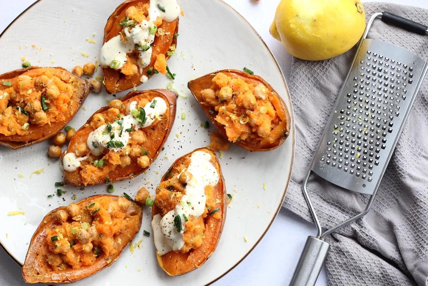 Fyldte søde kartofler med kikærter, grøn chili & yoghurtdressing