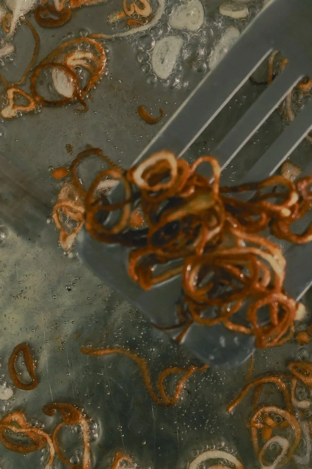 Skær skalotteløgene helt tyndt ud og friter dem i et godt lag solsikkeolie på en pande. Læg dem af på et stykke køkkenrulle, når de gyldner, så de kan ligge og blive sprøde.