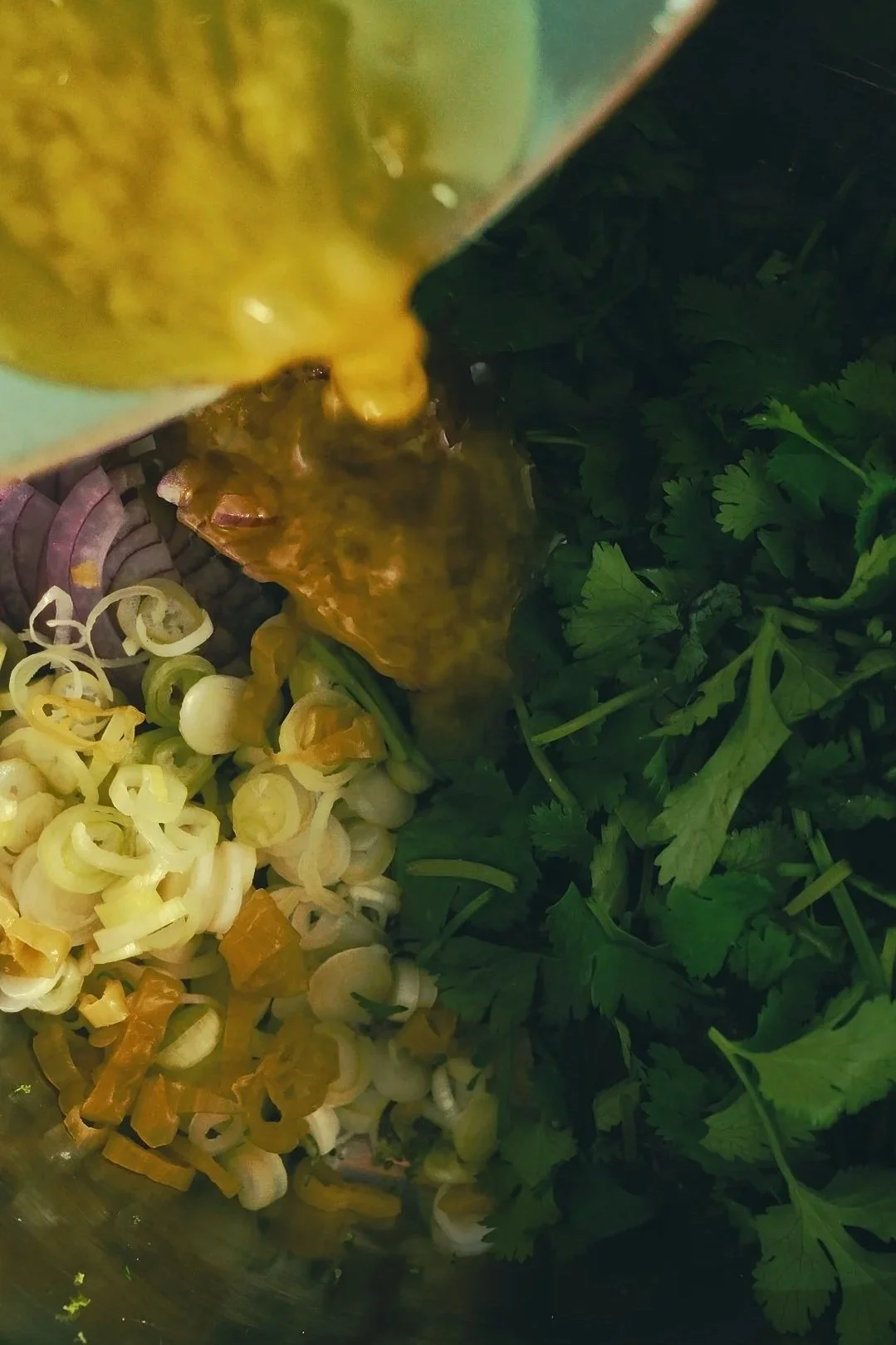 Den friske topping – et mix af rødløg, citrongræs, koriander, forårsløg, frisk chili og limeskal – tilfører en aromatisk og sprød kontrast, der gør retten både levende og let. Når alt vendes sammen med den simple dressing af ingefær, honning og lime, får du en salat, der både dufter og smager vidunderligt.