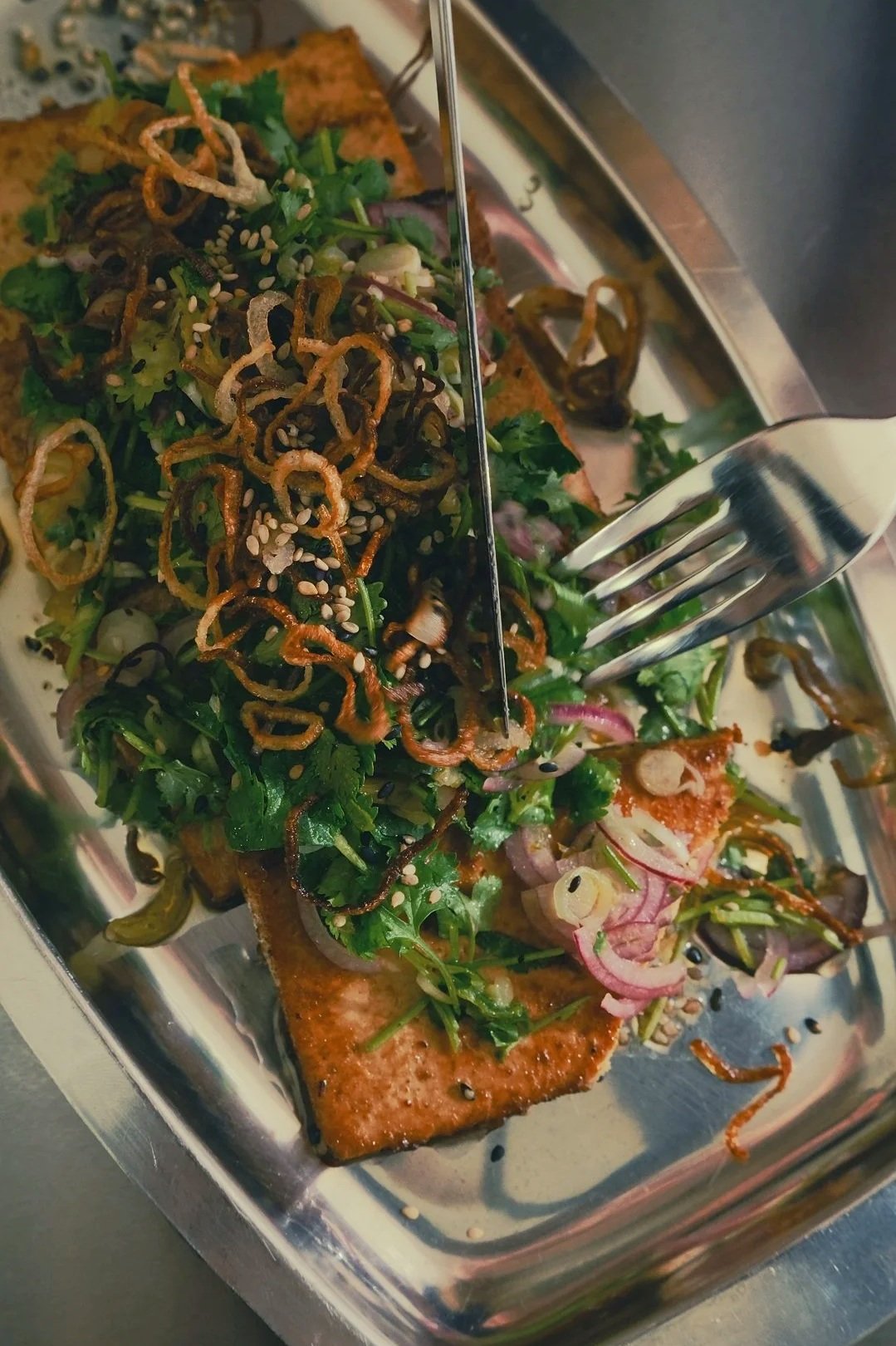 Velsmagende marineret tofu med frisk asiatisk salat og sprøde friterede løg – en kombination af umami, friske ingredienser og sprød tekstur på den helt rigtige måde. Opskriften er både nem at lave, sund og fyldt med dybde.