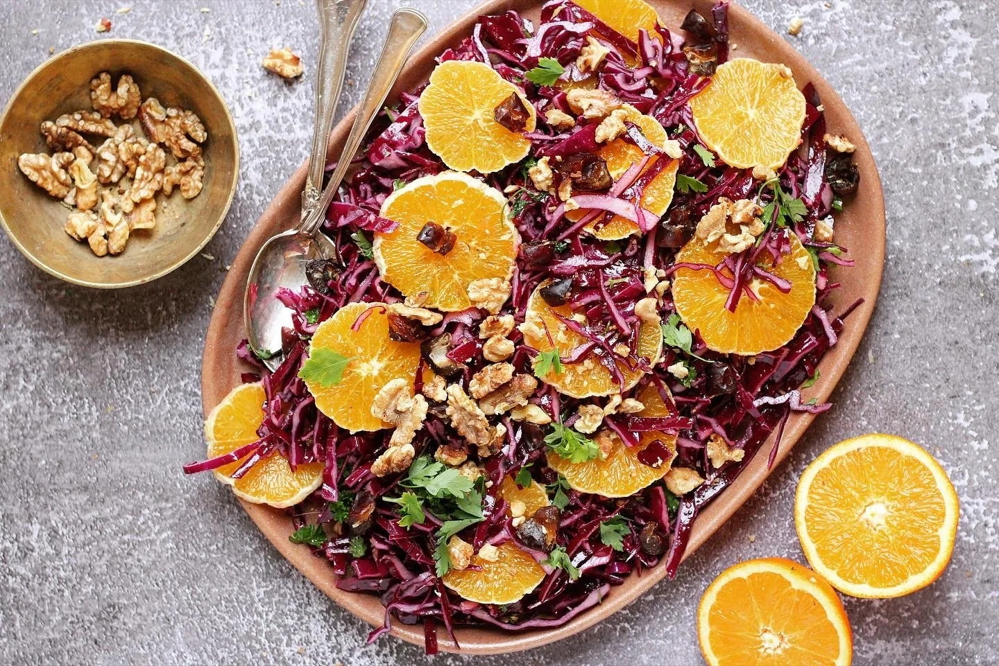 Selvom julen i allerhøjeste grad er omkring kartofler, brun sovs, julekonfekt og havregrynskugler så er det altså også meget lækkert med nogle forfriskende salater indimellem. Her får du et bud på en skøn og frisk salat med rødkål, appelsiner, dadler og ristede valnødder. Jeg er overbevist om, at dine julegæster og dig selv vil blive henrykte for at få denne serveret juleaften! Velbekomme og god jul!