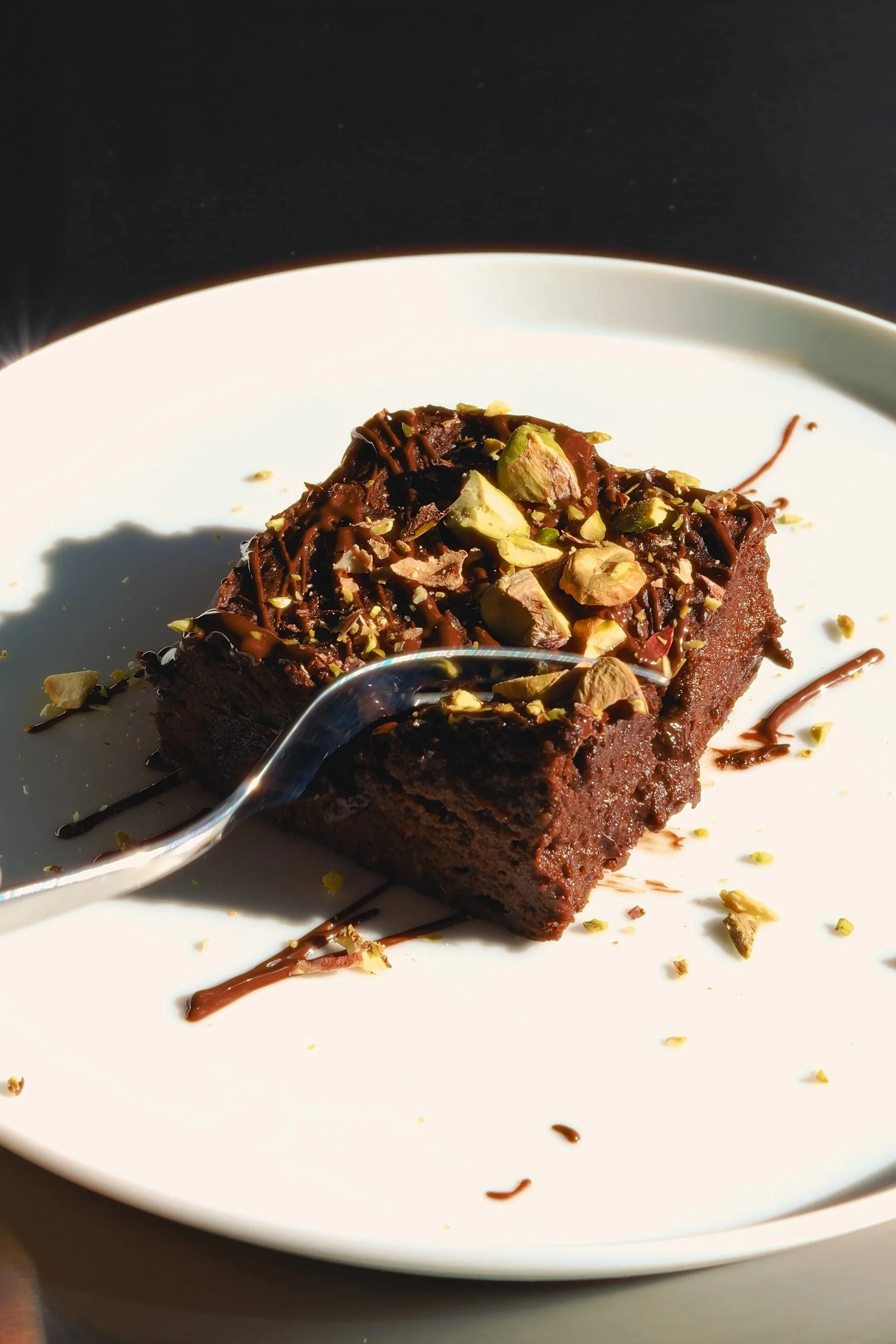 Et strejf af vanilje, lidt flagesalt og evt. et hint af chili giver brownien ekstra dybde, mens den sprøde topping af ristede pistacienødder tilføjer den perfekte kontrast til den bløde midte. Et dekorativt drys af smeltet mørk chokolade gør brownien ekstra indbydende.
