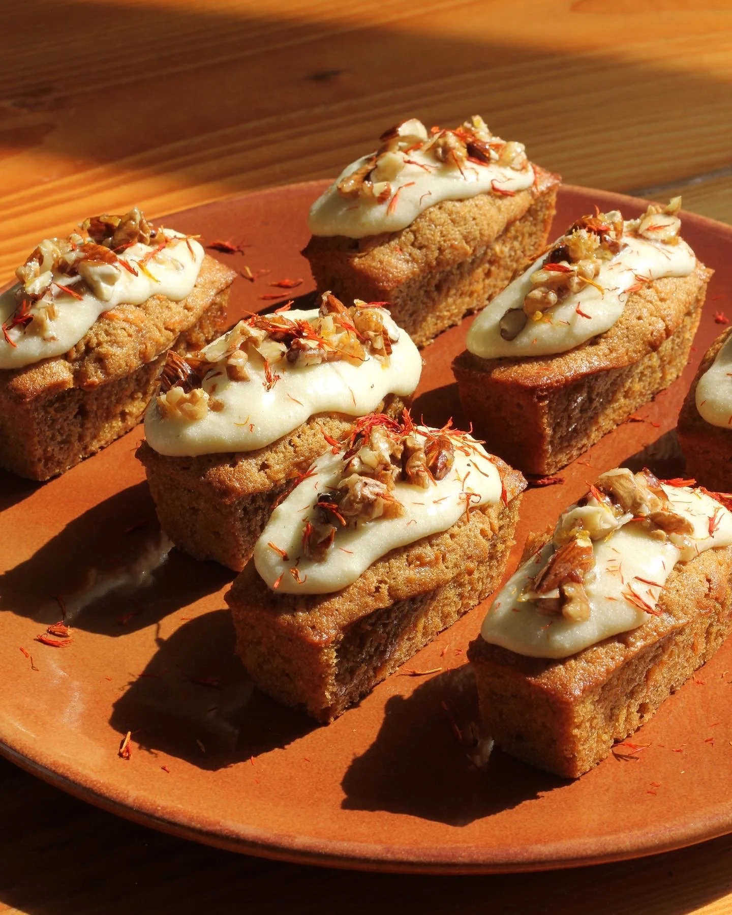 Små gulerodskager med citronfrosting og karameliserede nødder