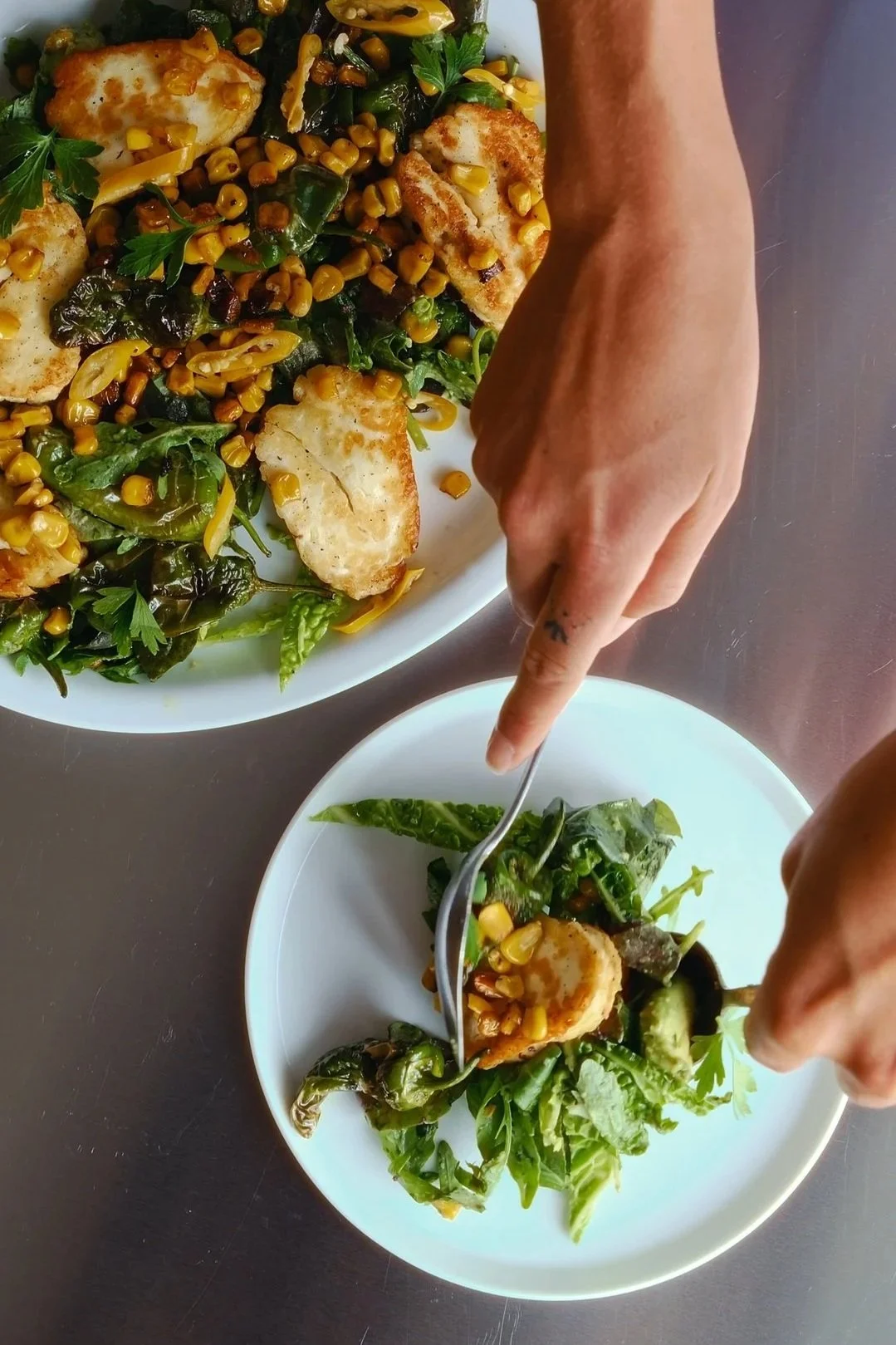 Sprød, farverig og fuld af smag – den her mexicansk-inspirerede salat kombinerer sprøde majs, salt halloumi ost og frisk, grøn salat med en sød-syrlig gremolata dressing. En ideel salat du kan spise til frokost eller som tilbehør til aftensmaden året rundt.