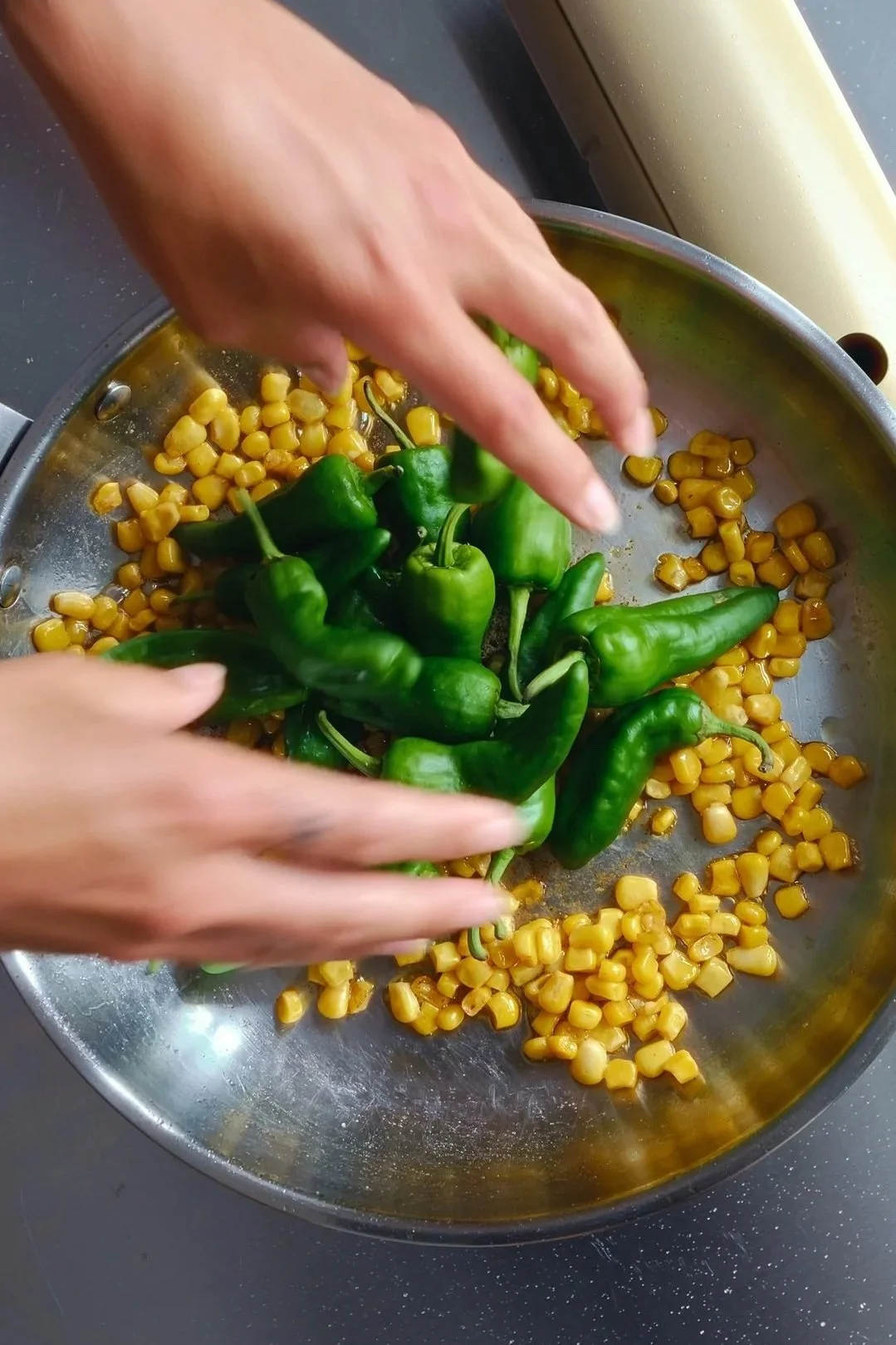 Hæld lidt mere olivenolie på panden sammen med padron peberne og steg dem i yderligere 4-5 min. eller til de begynder at gyldne.