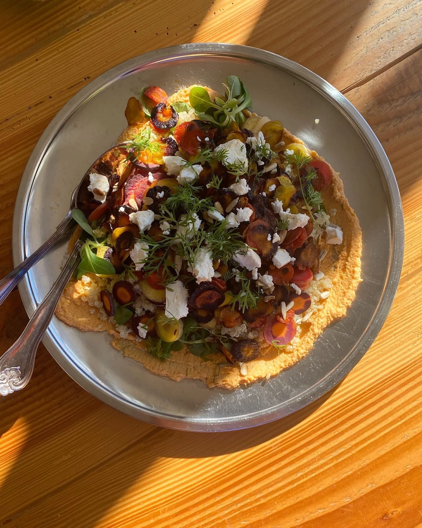 - Fordel hummusen på et serveringsfad, fordel derefter feldsalat, quinoa, gulerødder (både rå og bagte) ud på fadet. Top af med feta, solsikkekerner og dild.